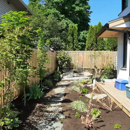 Being garden lovers several large raised garden beds were created to accomadate this deep passion and designed make the best use of the space where summer sun would still be accessible. From the concrete patio a flagged stone pathway takes one along and through the garden allowing one to slow down and enjoy the space around them. The path takes them along a rain garden that runs along the deck which wraps around the house, and leads one to a flagstone seating area dubbed "the ampitheatre" by the home owners where there can enjoy their breakfast in the early summer sun.